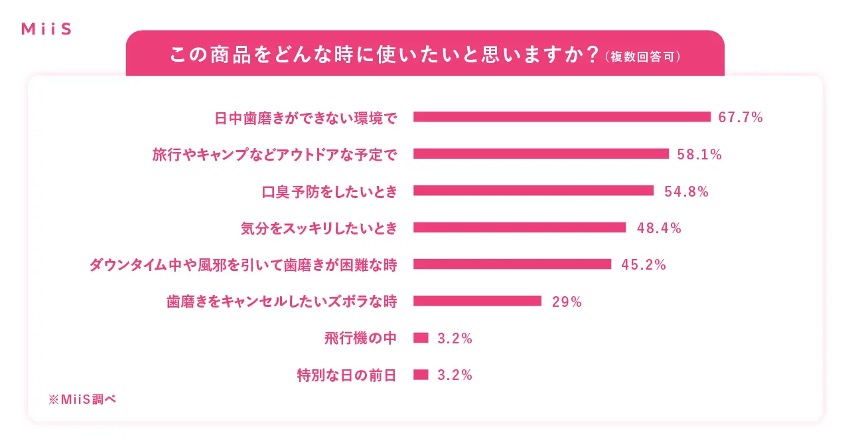 仕事中の会議前やランチ後、外出先、疲れて歯磨きできない夜。日常のあらゆるシーンで“第3の口腔ケア”として活躍します。