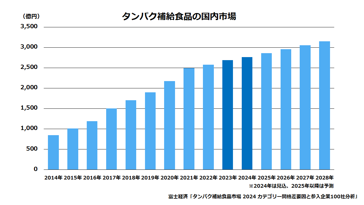 市場は、2015年からのタンパク補給ブームで新規ユーザーの獲得が進み急拡大し、2022年以降はプロテイン補給食品のリピーター増加で安定した拡大を続けています。
